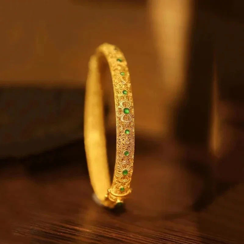 Ethnic Style Gold Green Gemstone & Floral Pattern Bangle Bracelet